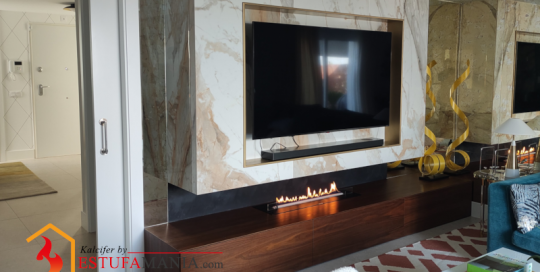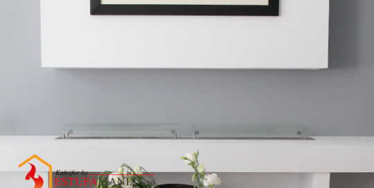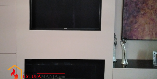 Televisión encima de chimenea de Bioetanol, con fondo y marco de cristal negroEstufamania2024-12-12T13:19:07+01:00