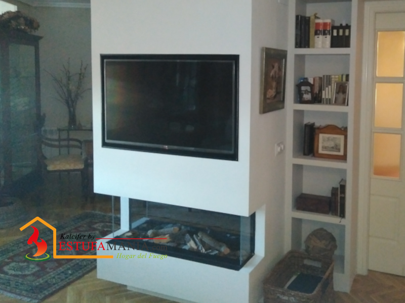 Se realiza libreria a medida y como prolongación se diseña un espigon para integrar en un mismo conjunto el pilar y una chimenea abierta a 3 lados para darle fluidez al conjunto.