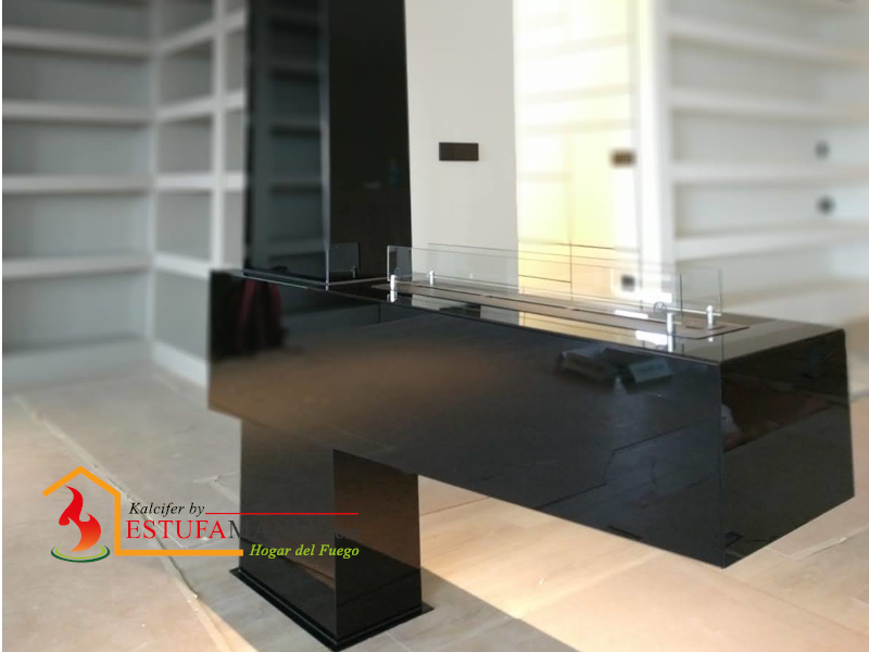 Separador de ambientes en acabado piedra negra, convirtiendo una columna en el centro de atención del salón con chimenea de Bioetanol Xaralyn, quemador de piedra ceramica con cristales