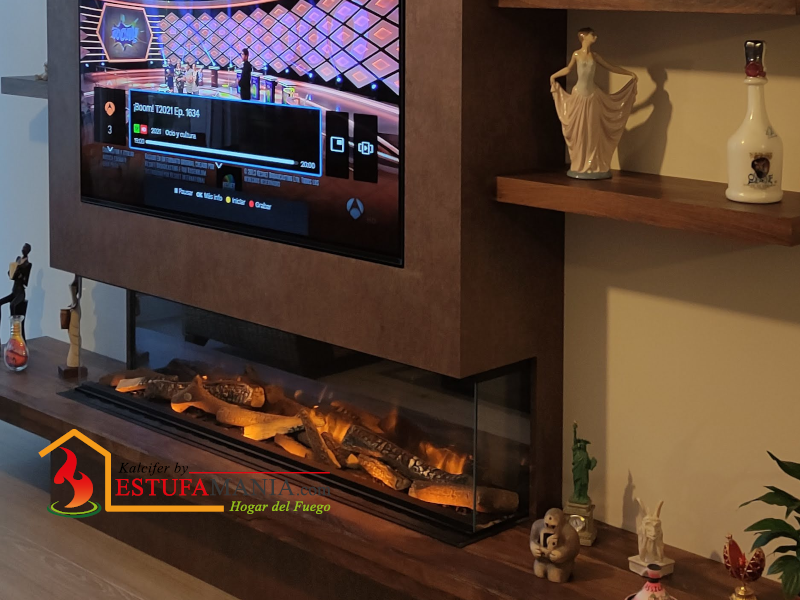 Integrando la chimenea electrica Evonic Fires E 1500 GF3, y la tlevisión embutida al milimetro en el mueble de madera acabado cobre corten con baldas asimetricas en madera natural reproduciendo el tono y textura de una mueble ya existente en el salón.