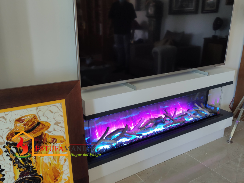 En menos de 2 horas se monto esta chimenea, Exo 1000 de Flamerite Fires, gracias a la opción nitra disponemos de un selector rgb, tanto en el mando a distancia como en la aplicación móvil, para seleccionar independientemente el color del efecto trasero y de la parte baja de nuestra chimenea.