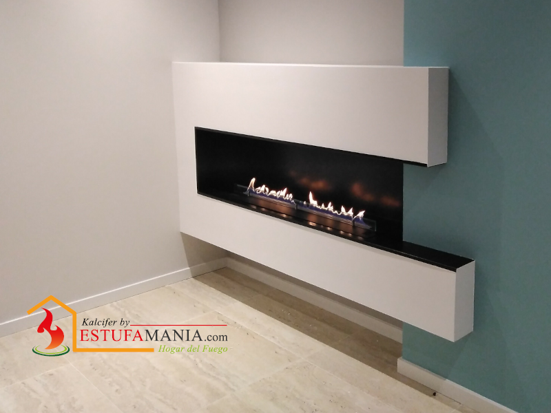 En este salón diseñamos, esta chimenea de bioetanol abierta al frente y un lateral, el lateral en azul se recrecio embebiendo una columna que exsitia en el medio del salón, y se aprovecho para albergar la televisión con su brazo extensible y barra de sonido incorporada y de ese modo poder ver la Televisión desde el jardin.